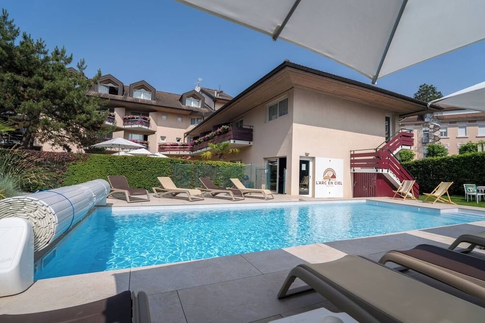Logis Hôtel L'Arc-En-Ciel ligt op 5 minuten lopen van het centrum van Thonon-les-Bains en beschikt over een buitenzwembad. Het biedt ruime kamers met gratis WiFi en een televisie. Elke kamer heeft een eigen badkamer, een minibar en een...