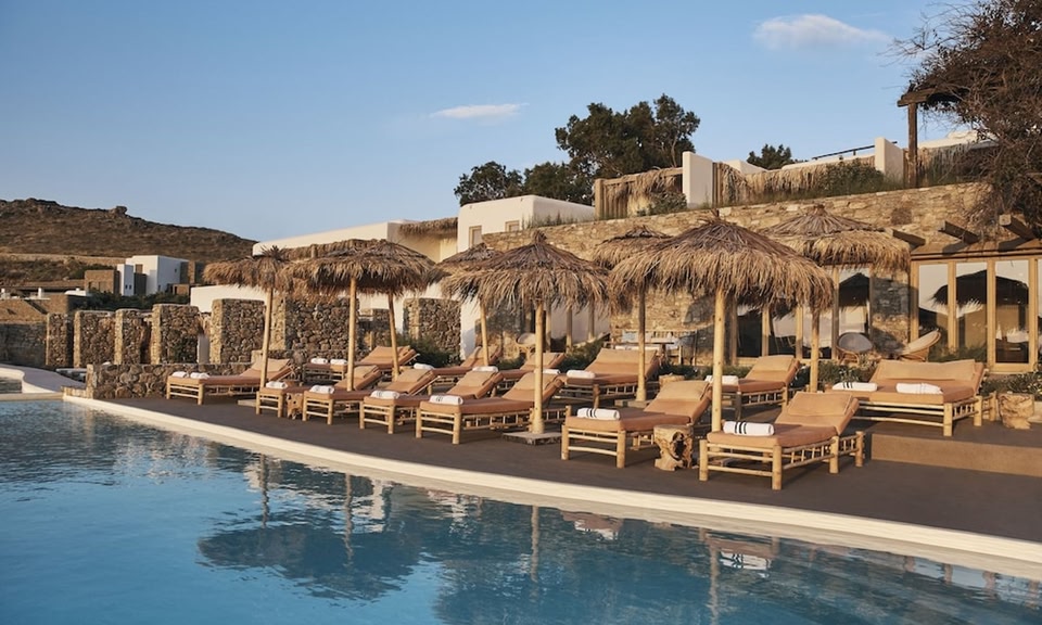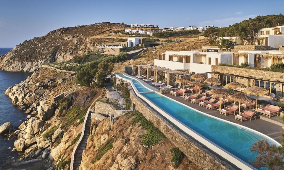 Dit hotel is gebouwd op een klif boven het strand van Kalafatis en biedt een privéstrand en een spacentrum. De accommodatie is gebouwd met respect voor de traditionele, lokale architectuur en toch verrijkt met moderne elementen.