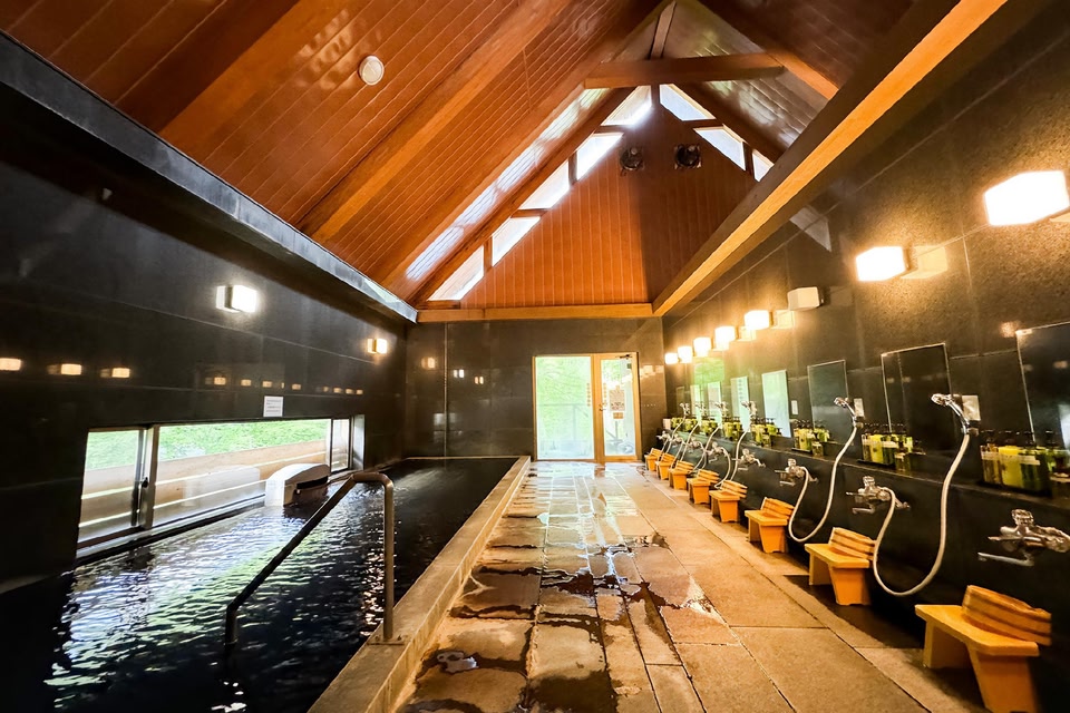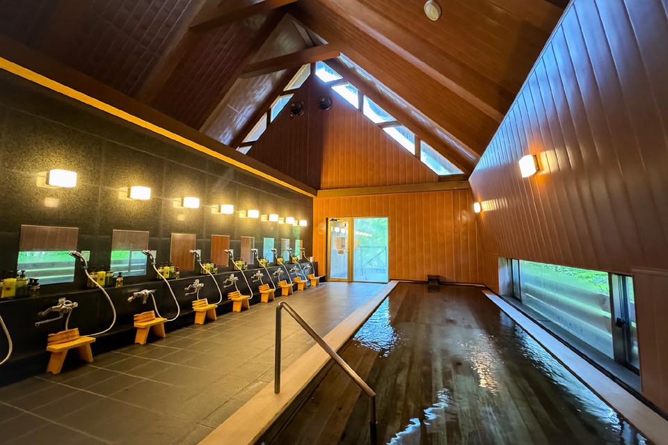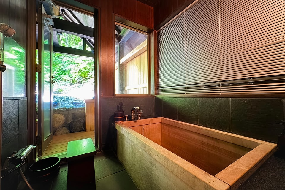 A stand-alone hot spring inn nestled in a lush mountainous region.